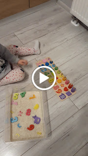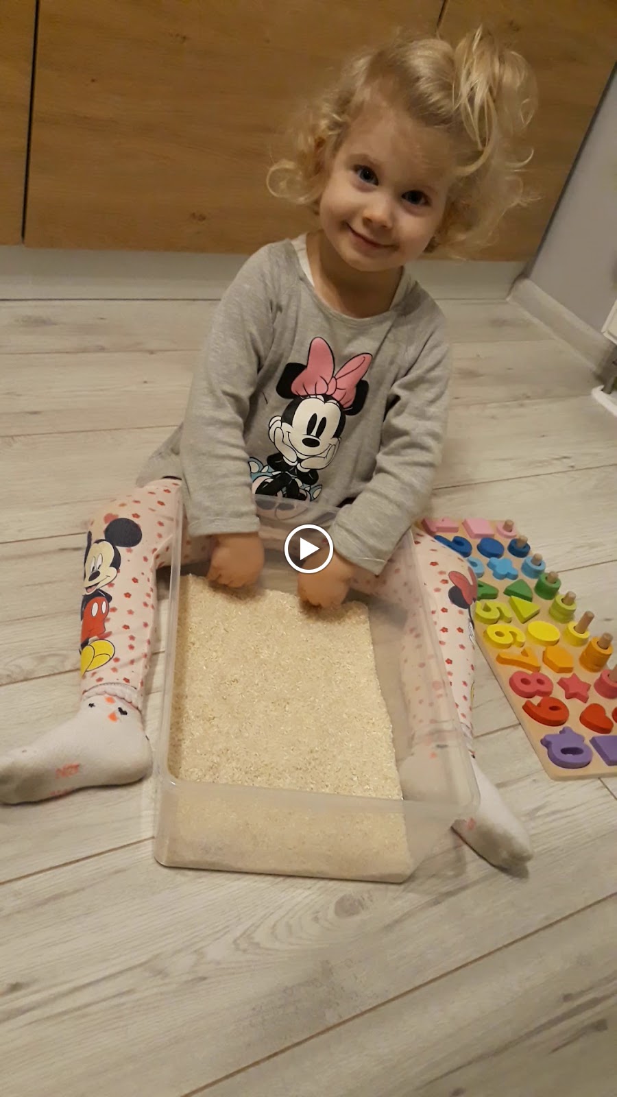 Bardzo lubiana przez dzieci zabawa sensoryczna. Do pudełka wsypujemy materiał sypki (u nas dziś ryż), wkładamy klocki/krążki/inne przedmioty, które dziecko może sortować/przeliczać i zaczynamy zabawę.