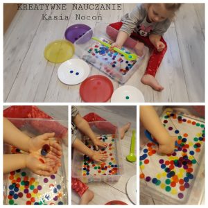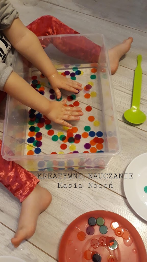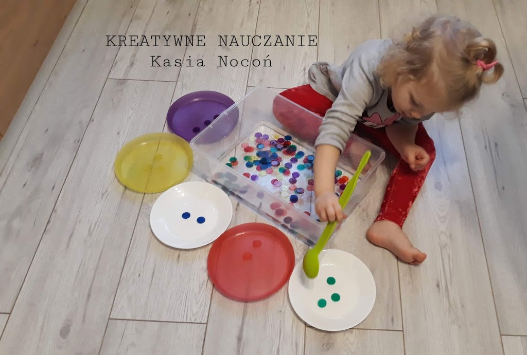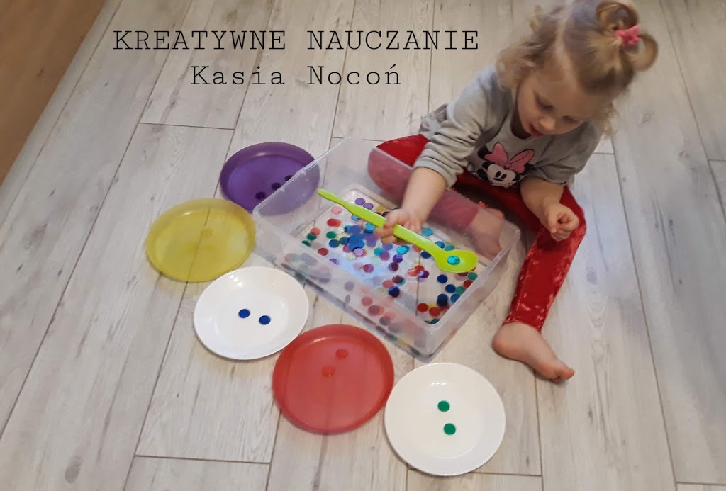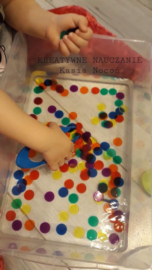 Kolorowe, plastikowe szkiełka sortowałyśmy wg kolorów. Wyławiane były najpierw za pomocą łyżki, później szczypcami, a na koniec paluszkami 😊