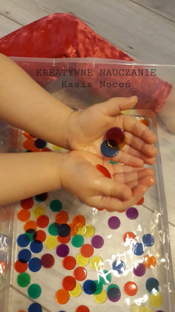 Zabawa kolorowymi, plastikowymi szkiełkami