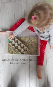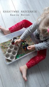 – odszukiwać zasypane zabawki (u nas samochodziki z Kinder Niespodzianki)
