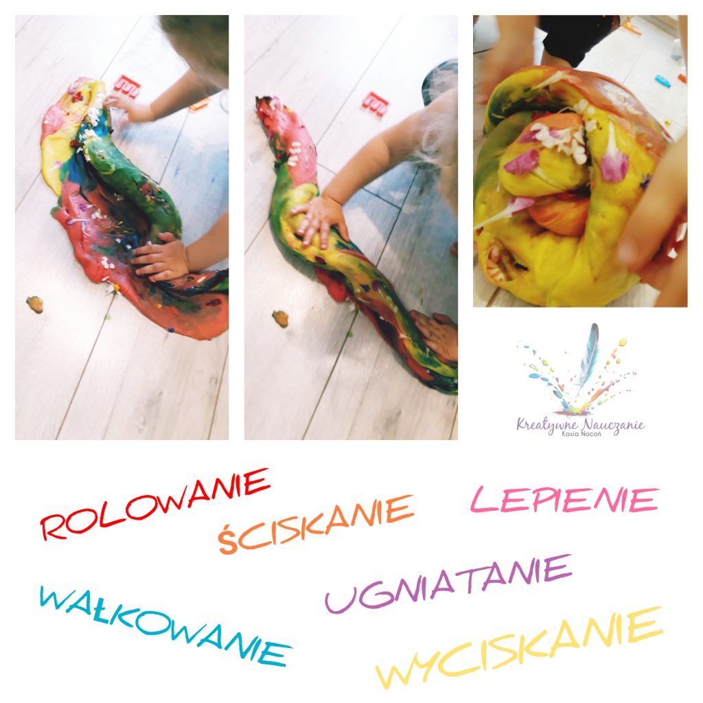 Twoje dziecko może masy rolować, ugniatać paluszkami, wałkować, rozciągać, robić kulki, wyklejać, budować z niej.