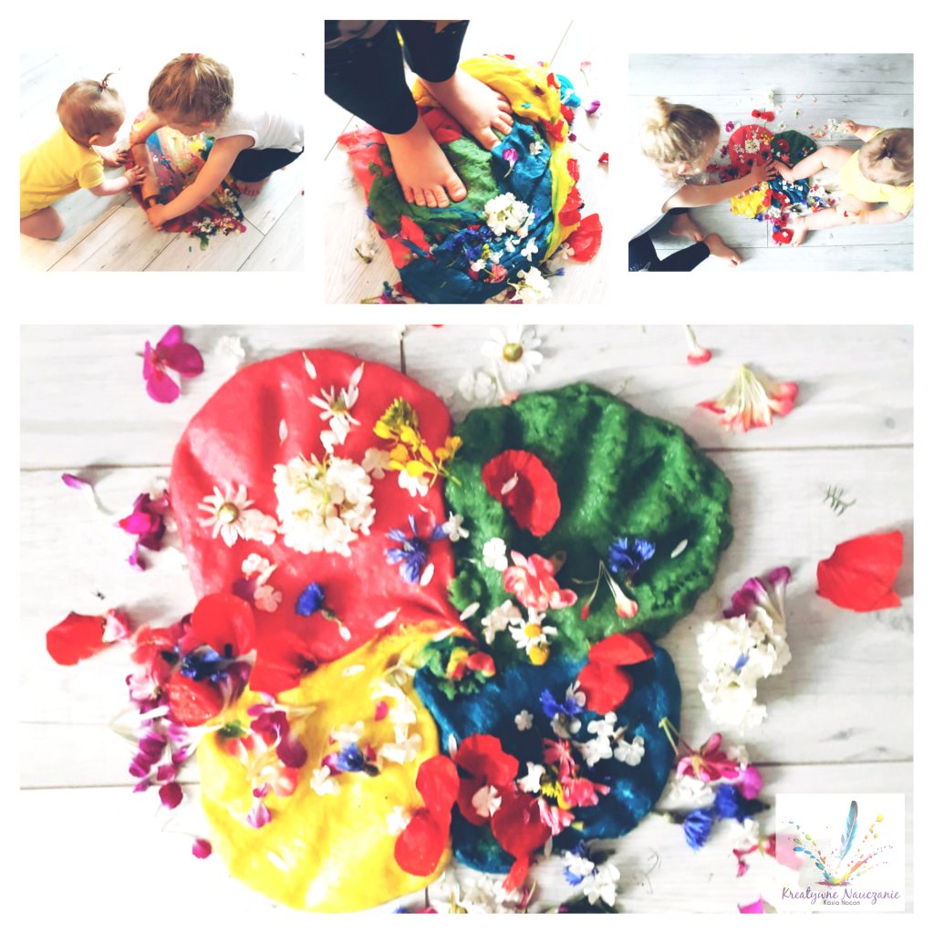 A dziś dodatkowo wzbogaciliśmy naszą masę o płatki kwiatów. Pogoda nie sprzyjała spacerom, więc dzięki tej zabawie poczuliśmy się przez chwilę tak, jakbyśmy byli na łące pełnej kwiatów 🙂