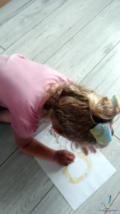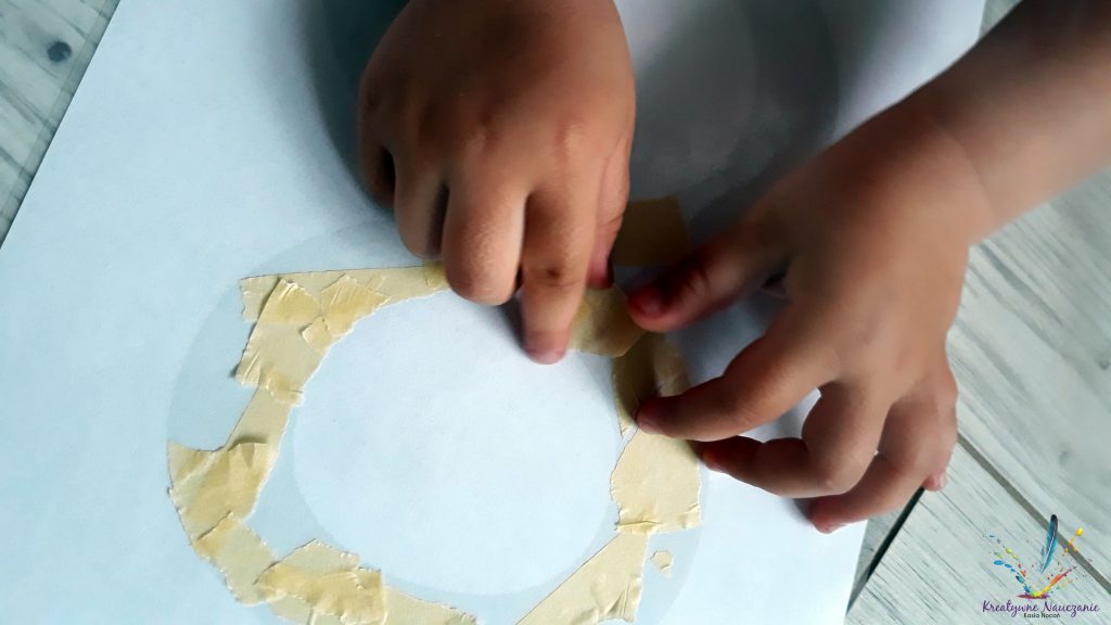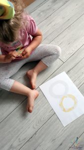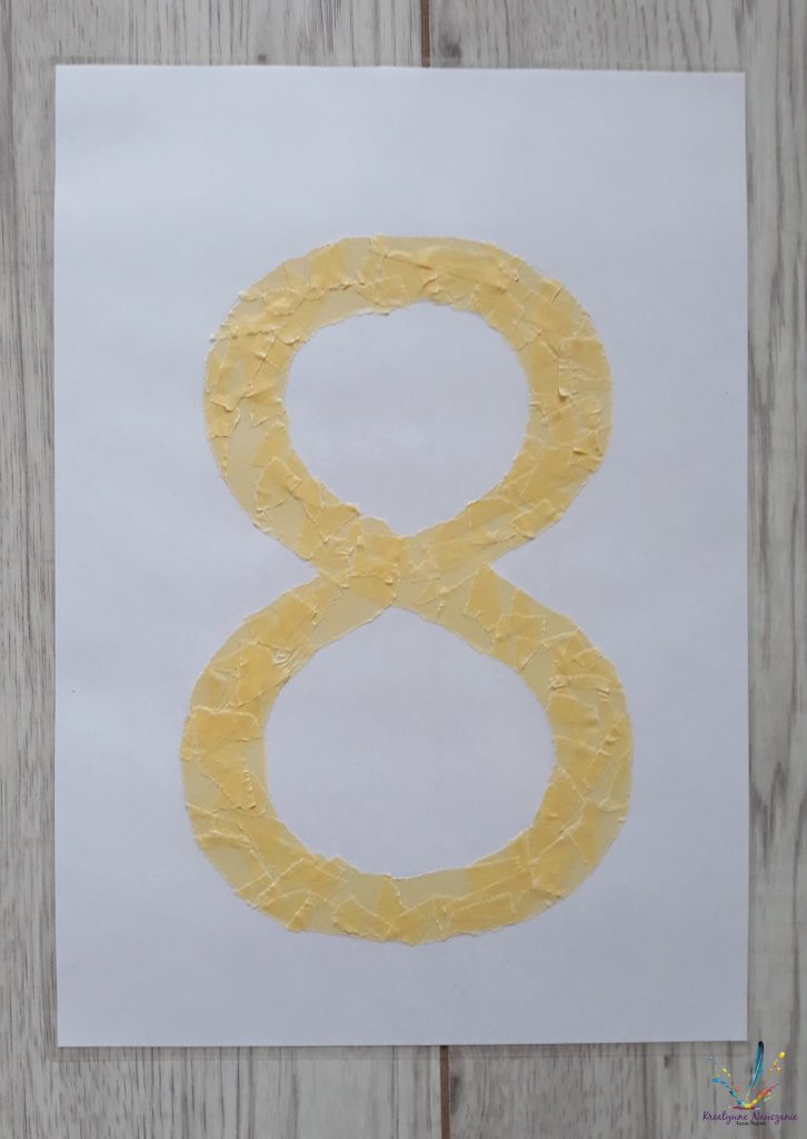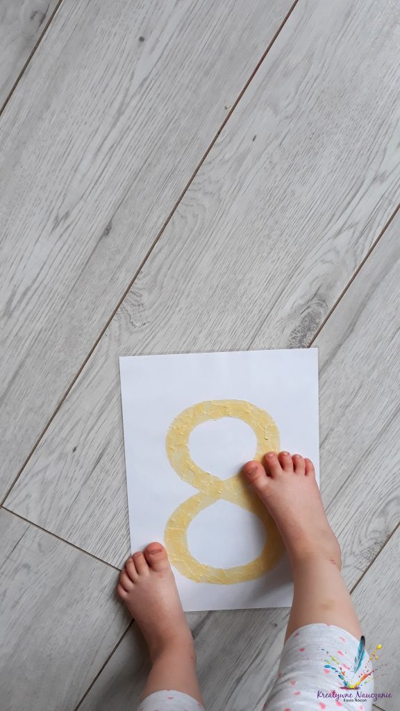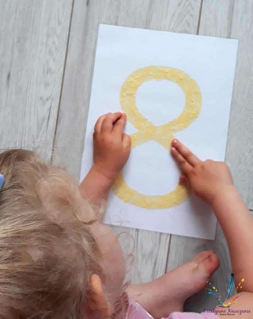 Cyfry możecie zostawić w takiej formie, w jakiej przykleiło je dziecko, a za jakiś czas wrócić do zabawy w zaklejanie szarej powierzchni lub/i stworzyć drugą wersję samodzielnie na wzór.