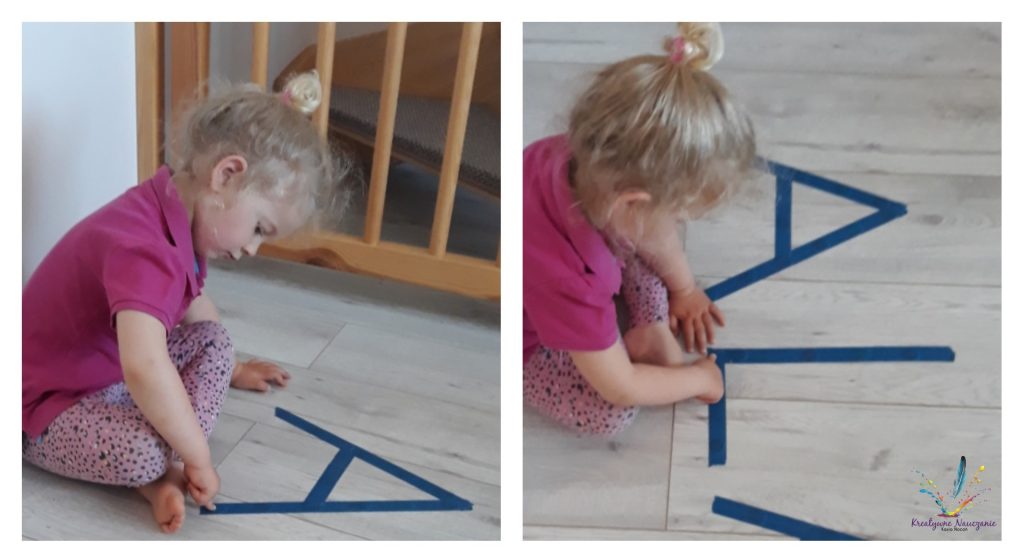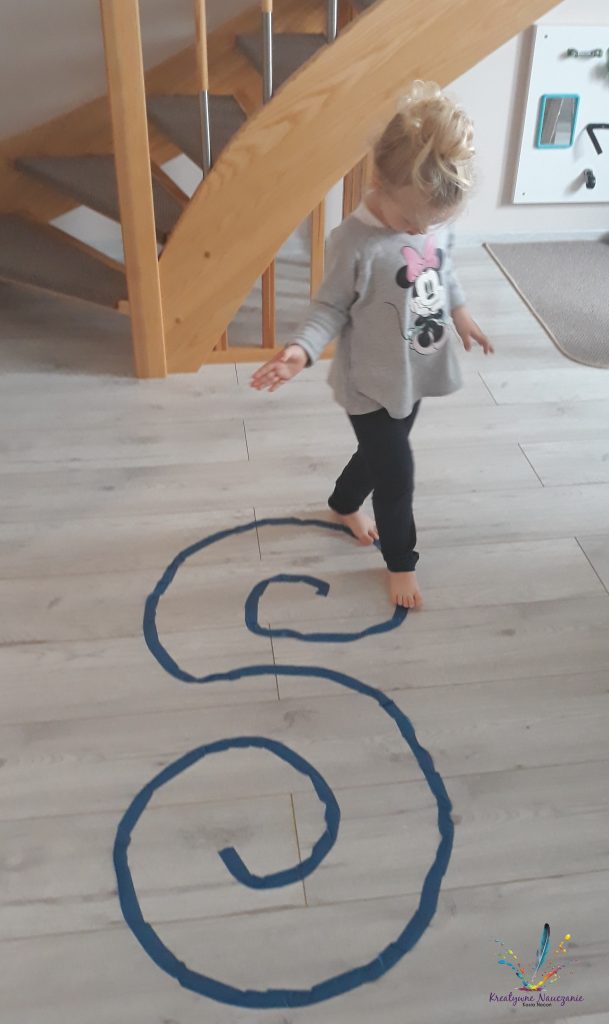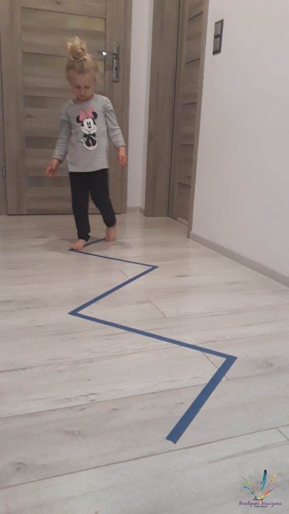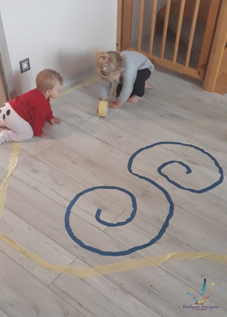 Podobnie bawimy się w deszczowe dni w domu. Jednak zamiast pisać kredą, wyklejamy linie taśmą.