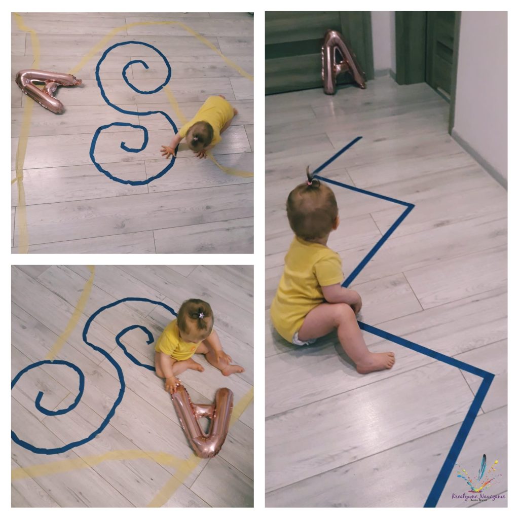 Dla doznań sensorycznych podkleiłam taśmę plastikowymi szkiełkami. Alicja najpierw po nim chodziła, a później wodziła palcem po literach.
