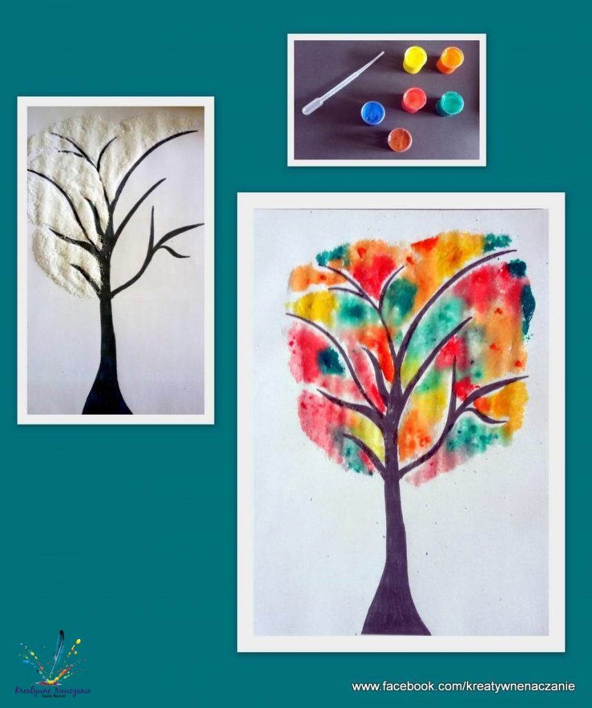 Markerem narysowałam drzewo, dzieci smarowały kartkę klejem, sypały na nią sól, a na koniec pipetami przenosiły na sól wodę z barwnikiem spożywczym.