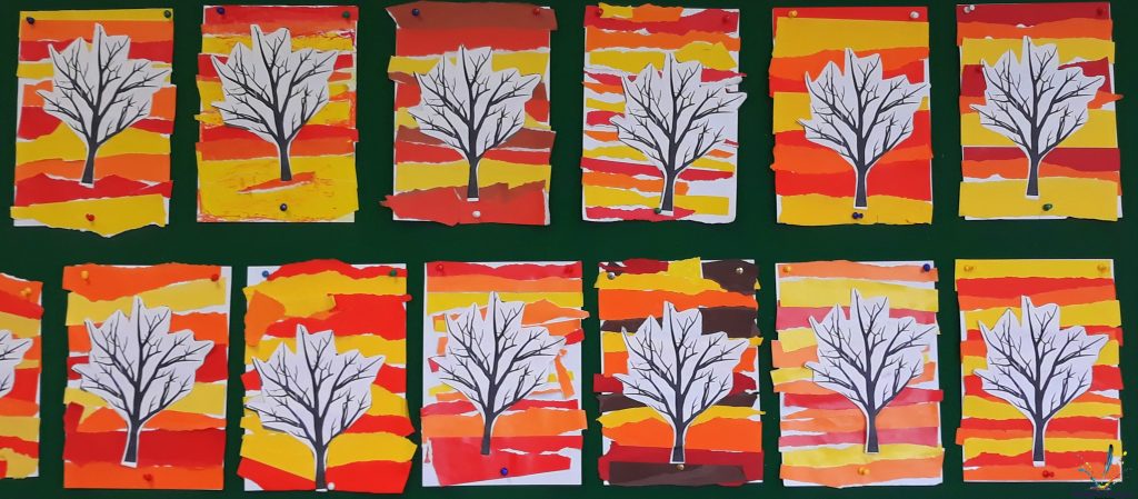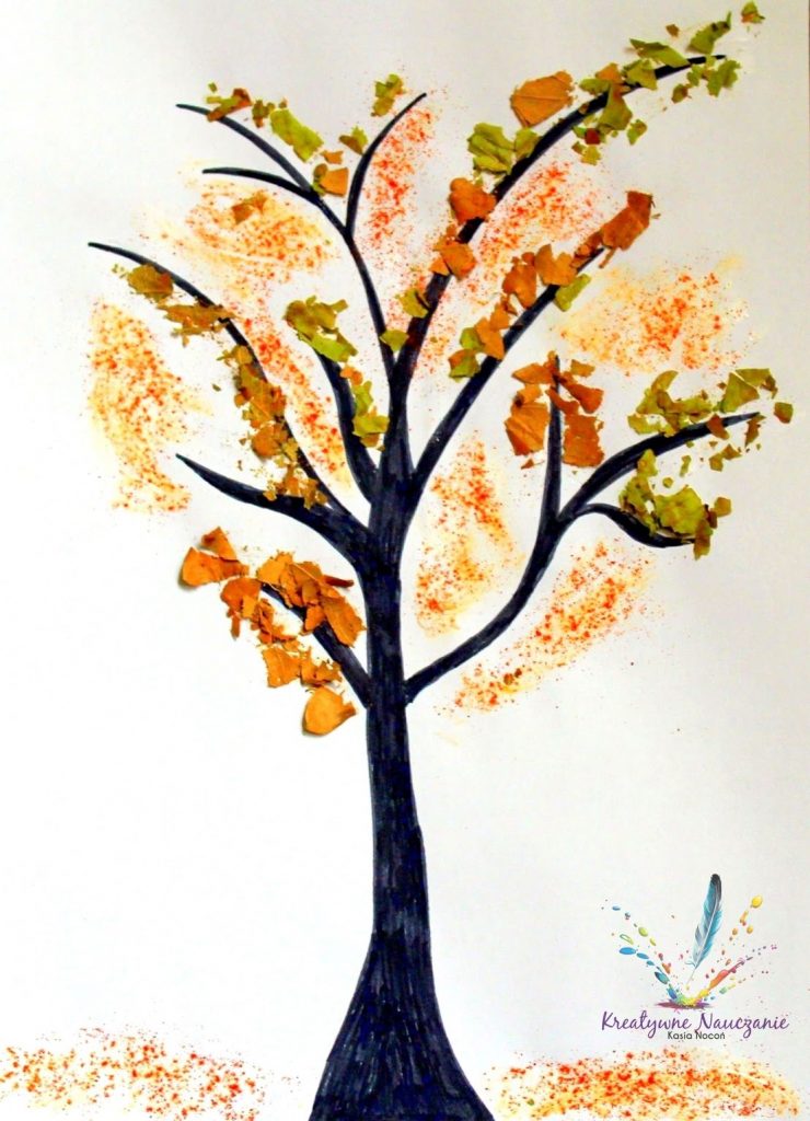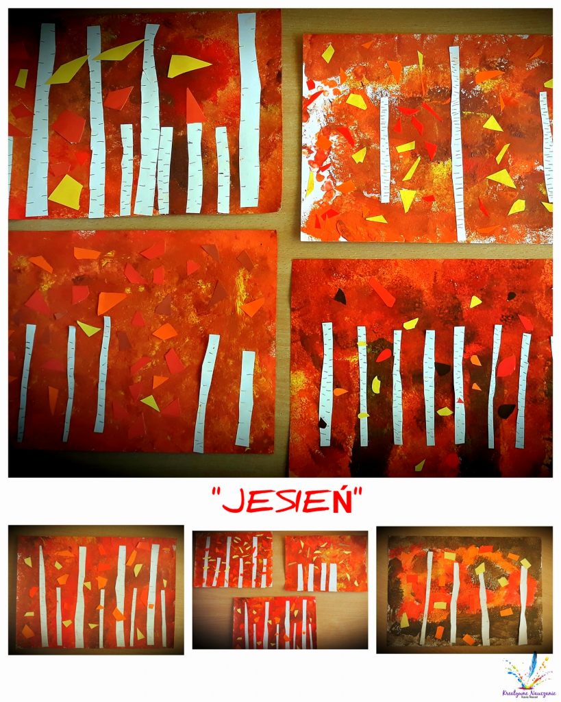 Tło wykonane farbami (odbijane gąbkami), drzewa wycięte z białego papieru rysunkowego. Praca ozdobiona kawałkami kolorowego papieru.