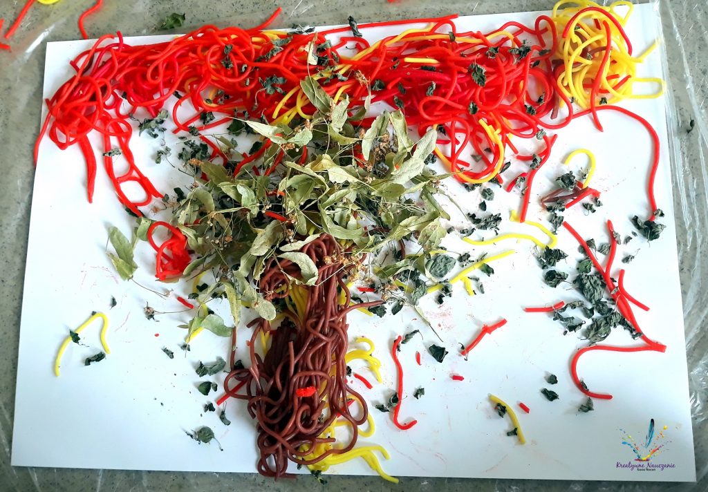 Kompozycja wykonana z makaronu ugotowanego w barwnikach spożywczych oraz suszonej lipy i oregano.