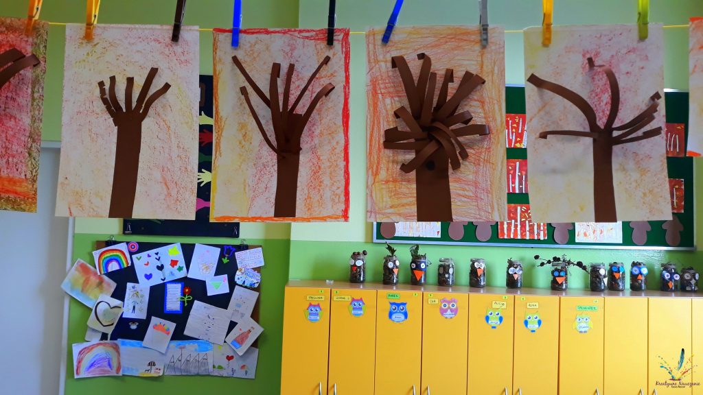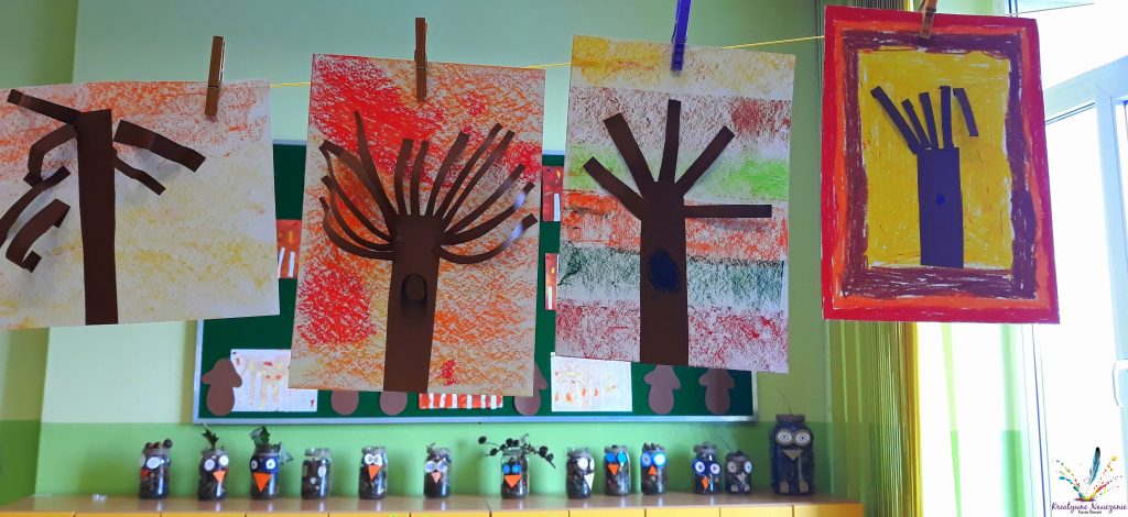 Drzewa 3D. Tło wykonane pastelami, a w tle sowy w słoikach z darów jesieni 🙂