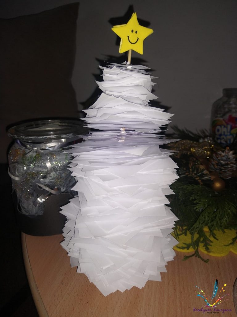 Z plasteliny uformowałam pień, w który włożyłam patyczek do szaszłyka. Później nabijałam kolejno od największego do najmniejszego skrawki papieru w kształcie kwadratu.
