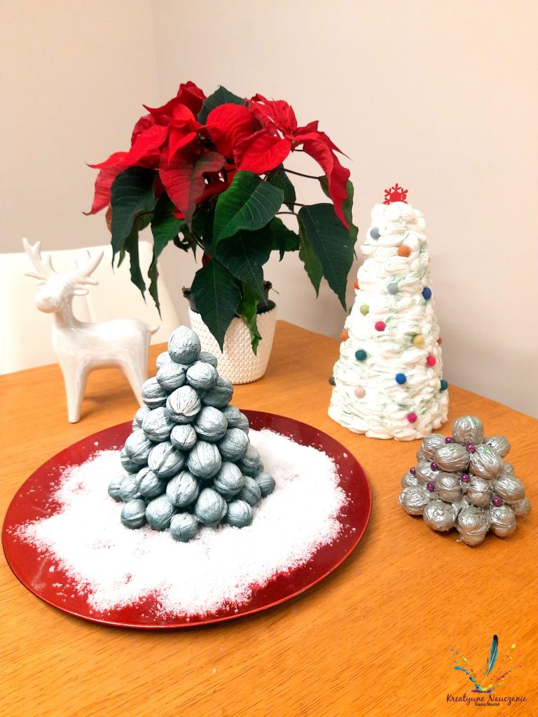 Choinka wykonana z orzechów, przyklejona klejem na gorąco, pomalowana zieloną, a następnie białą farbą sprayu.