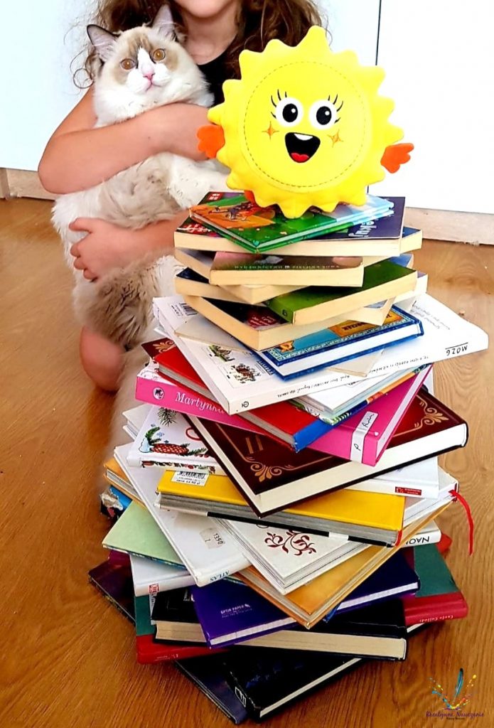 Jedno z moich ulubionych zdjęć, przesłane przez uczennicę jako potwierdzenie wykonania zadania adwentowego: „Potrafisz ułożyć choinkę z książek? Spróbuj!”.