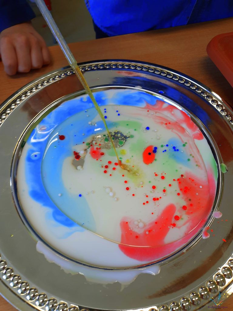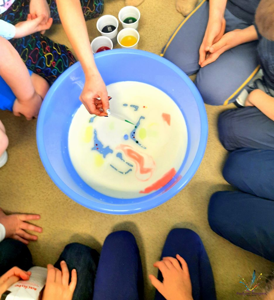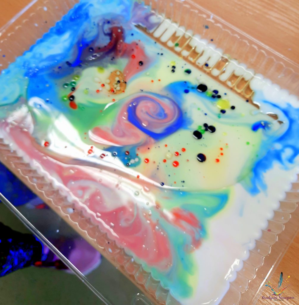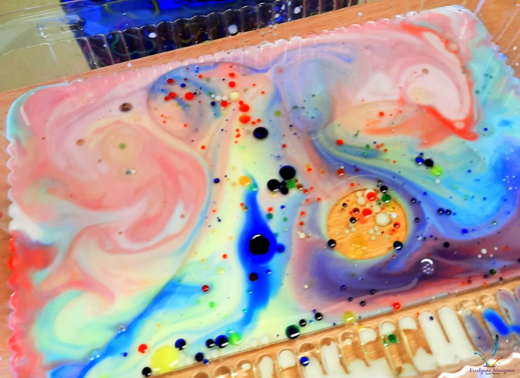 Wystarczy wlać do pojemnika mleko i olej, a następnie pipetą przenosić zabarwiona wodę. Nie ma tutaj żadnych proporcji. Bawimy się, testujemy, eksperymentujemy!