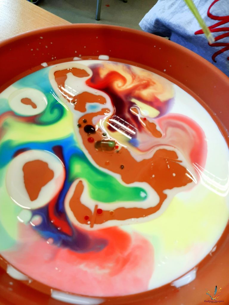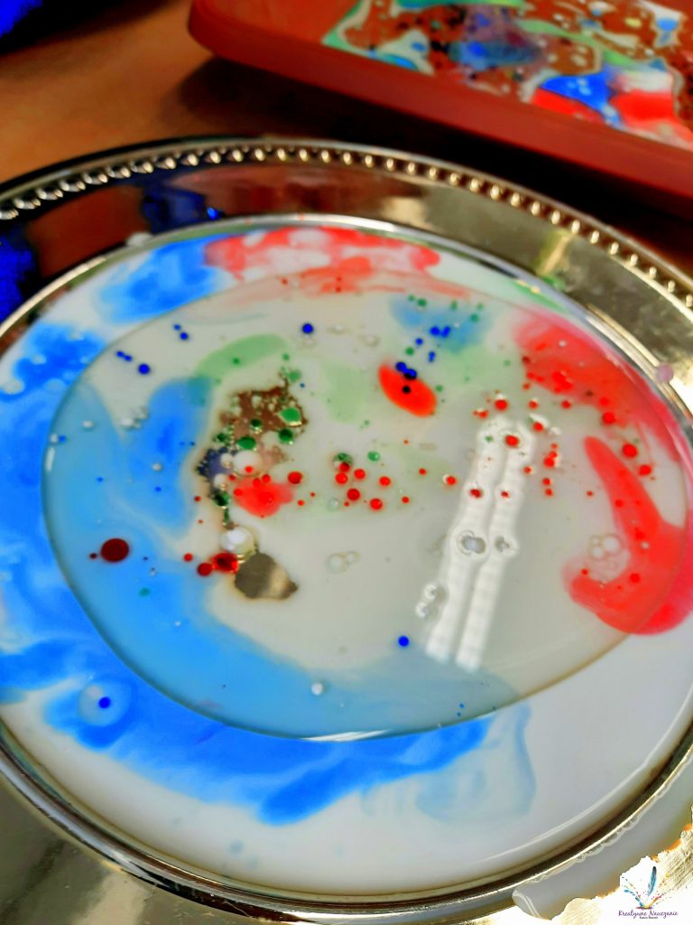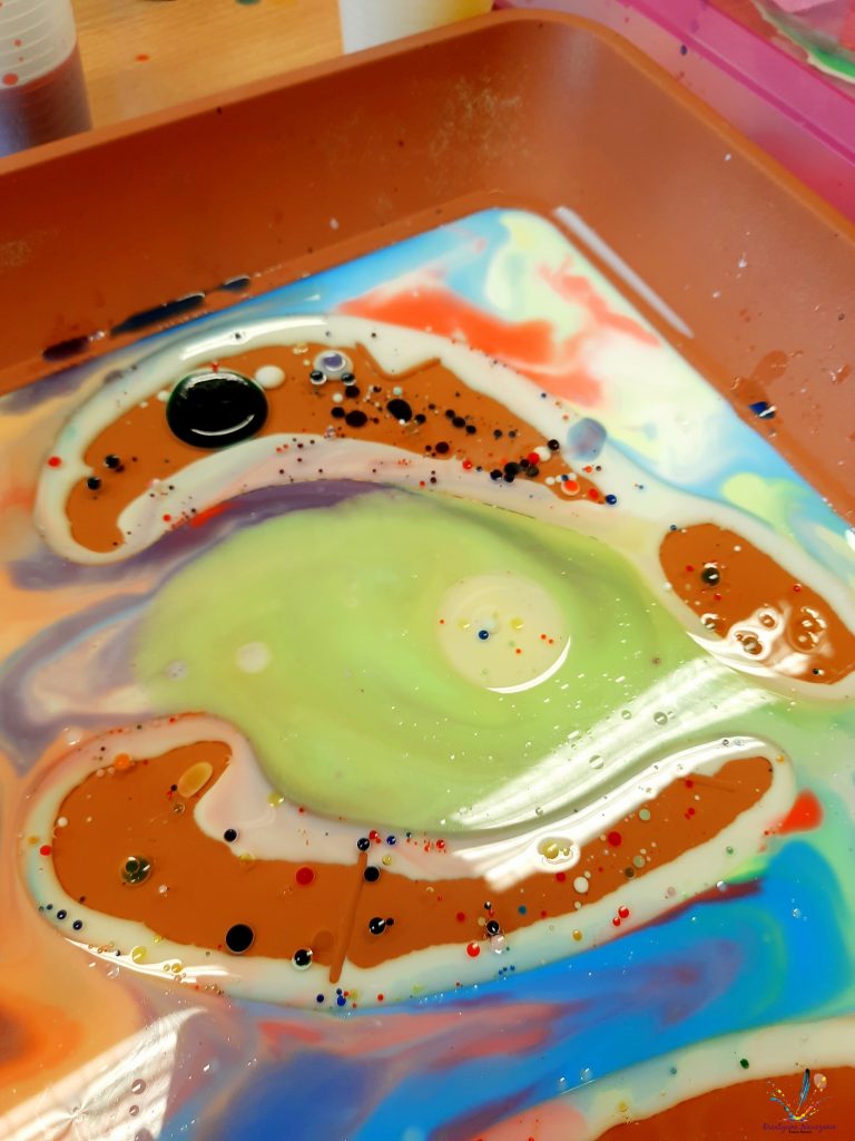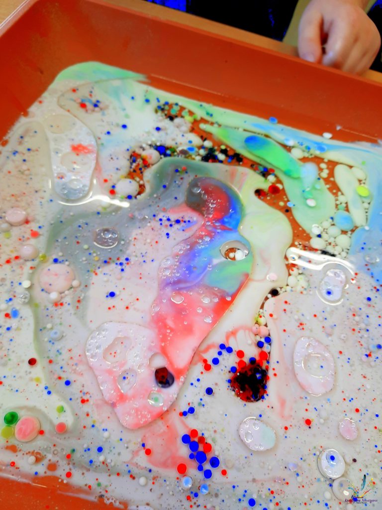 Wystarczy wlać do pojemnika mleko i olej, a następnie pipetą przenosić zabarwiona wodę. Nie ma tutaj żadnych proporcji. Bawimy się, testujemy, eksperymentujemy!