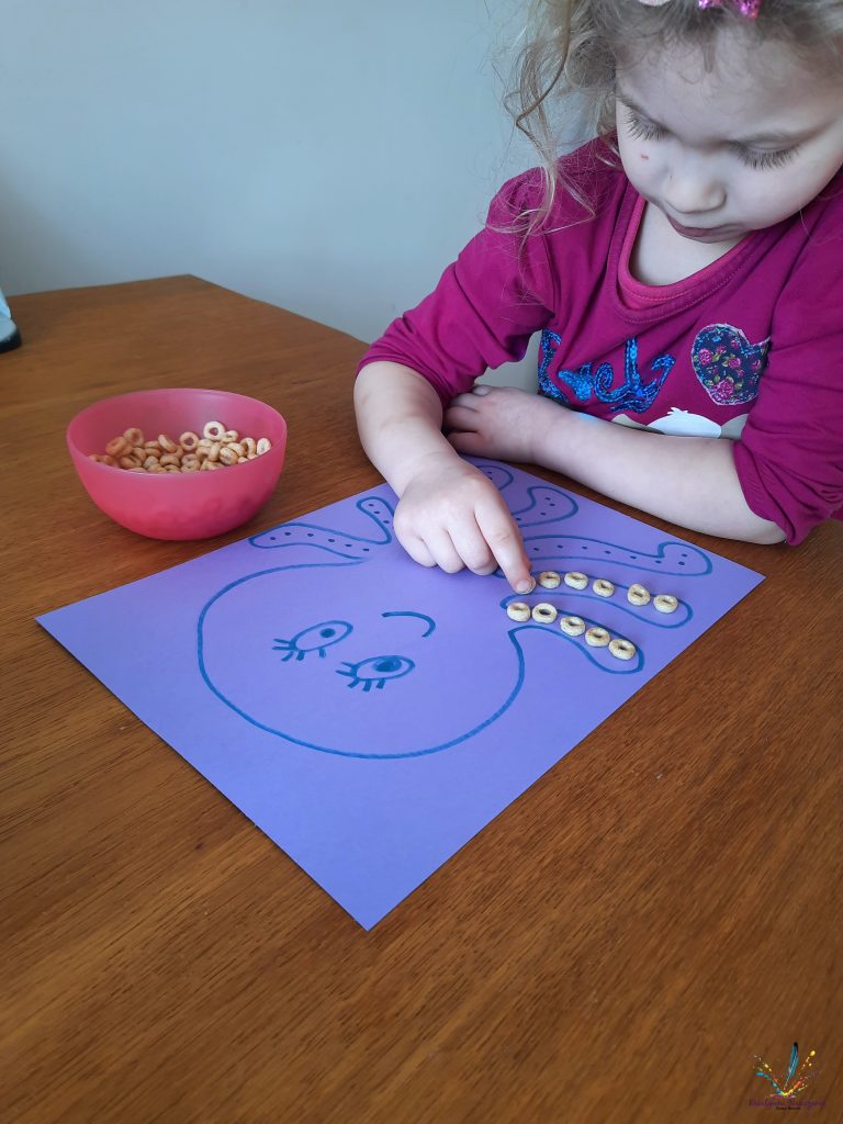 Narysowałam ośmiornicę, a zadaniem Alicji było naniesienie płatków-przyssawek na kropeczki.