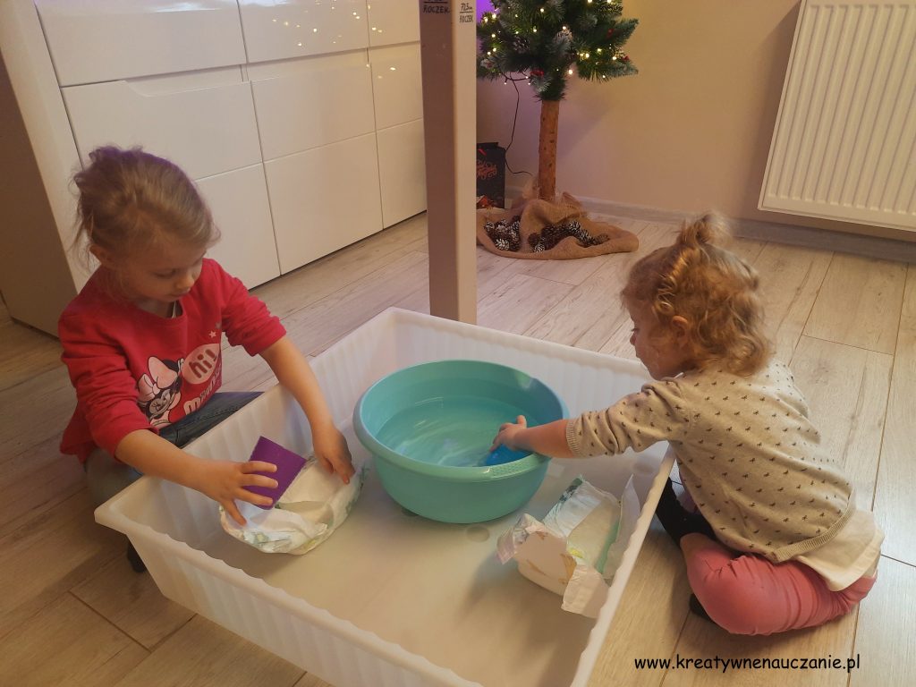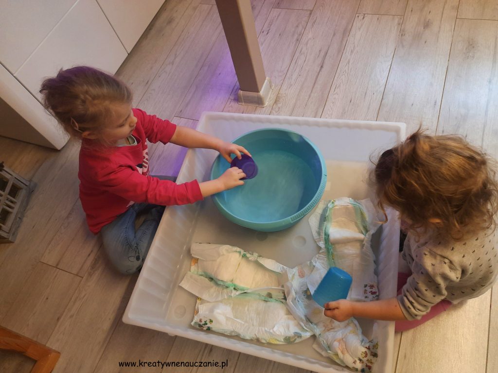 Do tej zabawy potrzebną są nam jedynie pampersy i woda.