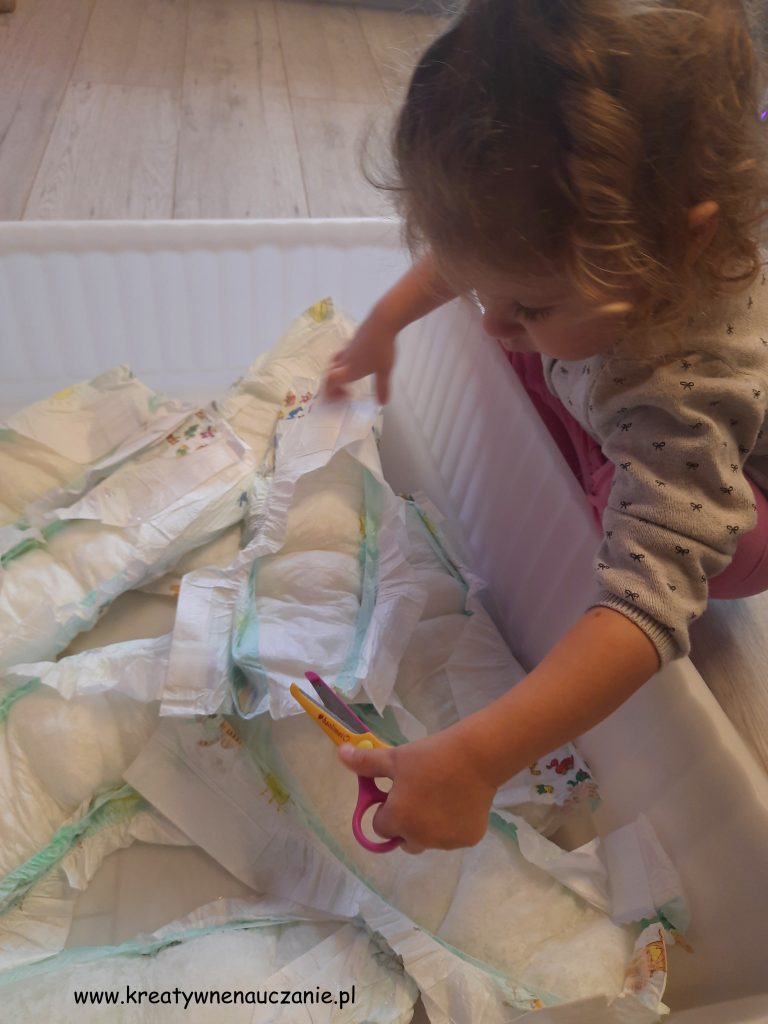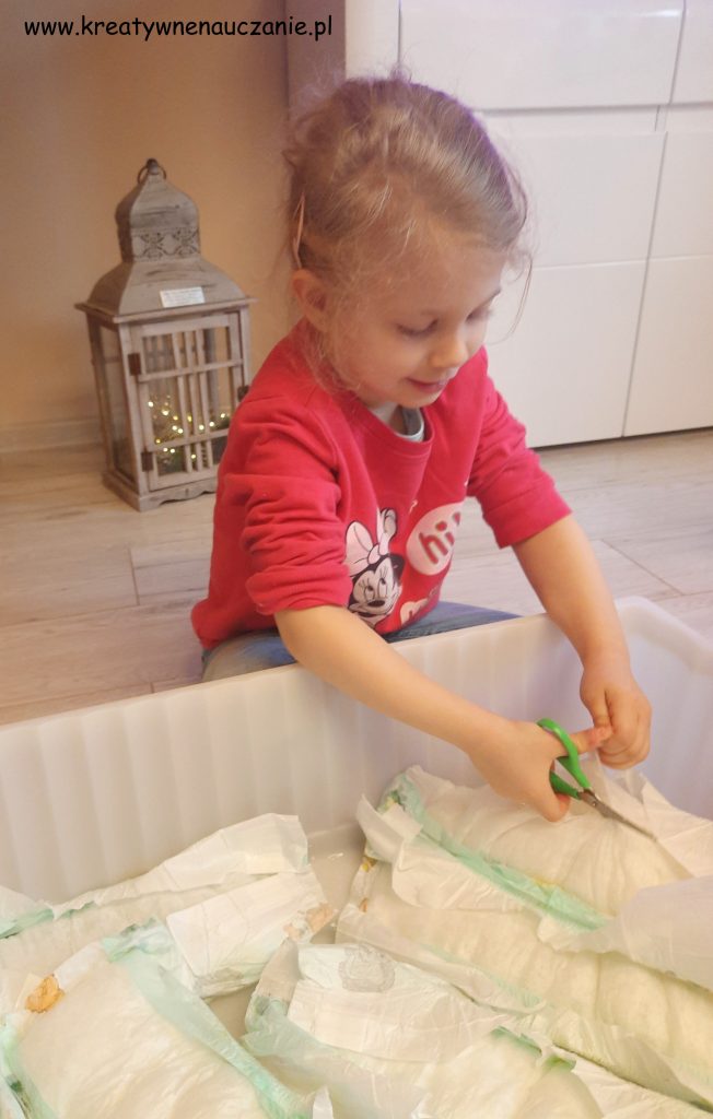 Do suchych pampersów wlewałyśmy wodę (możecie wlewać ciepłą lub zimną) i czekałyśmy, aby nasiąknęły. Następnie przecinałyśmy je, aby wydobyć granulat ze środka. Resztę pampersa od razu wyrzucałyśmy do śmieci.