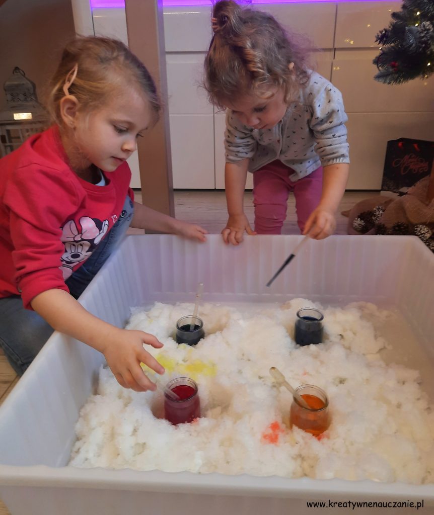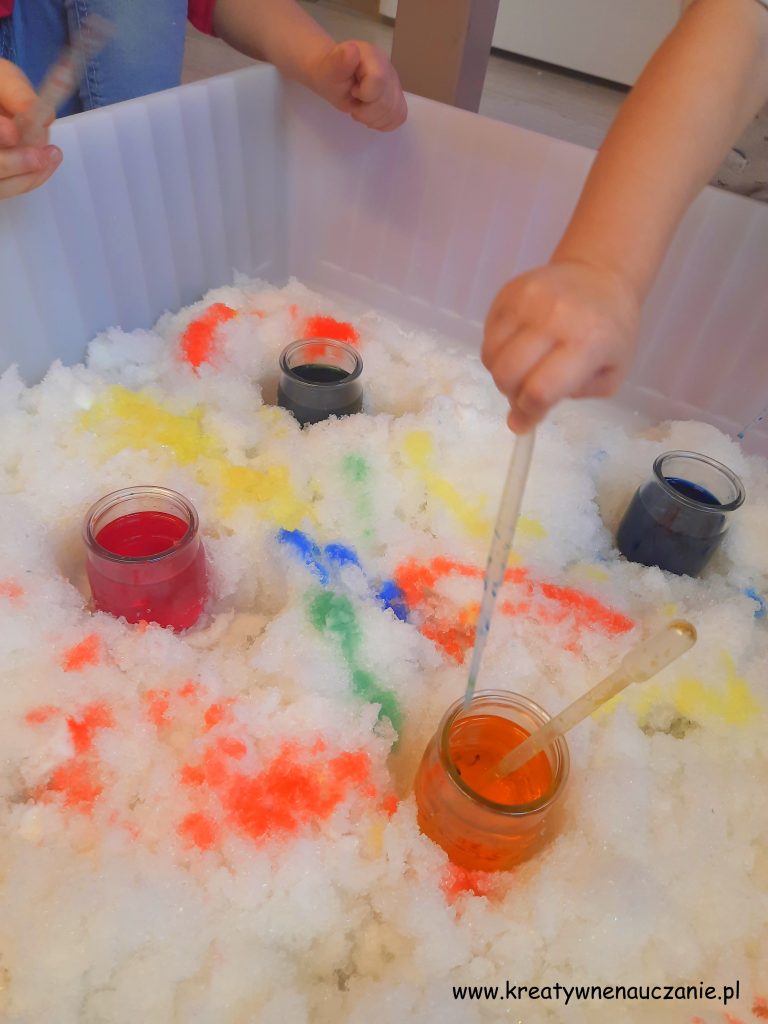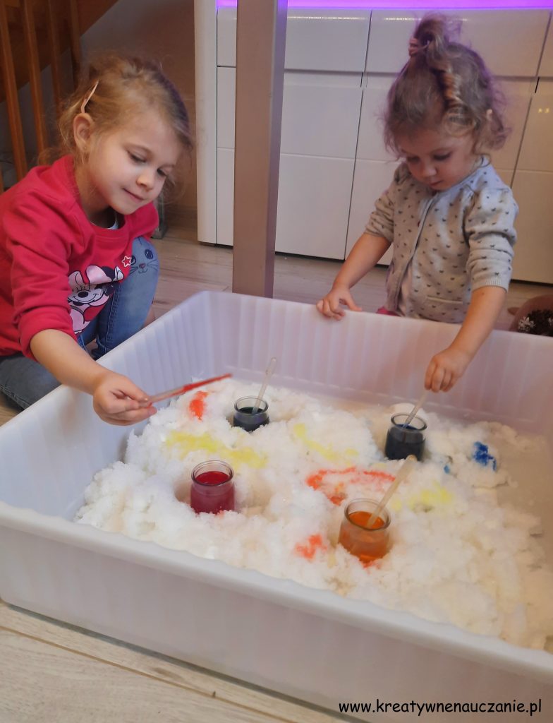 Dziewczynki przenosiły pipetą kolorową wodę barwiąc śnieg. To dopiero była frajda!