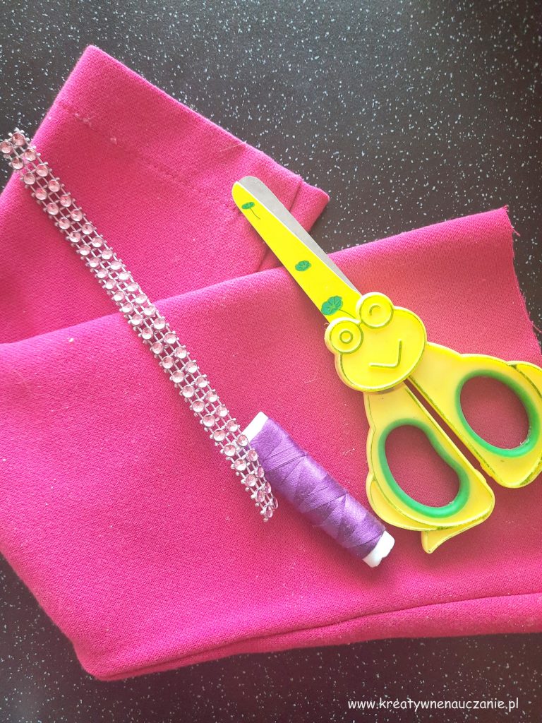 Kiedy fryzura była gotowa, zabrałam się za szycie sukienki, według wskazówek Alicji. Przydały się skrawki materiału i koraliki. Gdybym potrafiła szyć na maszynie, sprawa byłaby prostsza! Ratowałam się ręcznym szyciem, męcząc… ale czego się nie robi dla swojej Pociechy ![]()