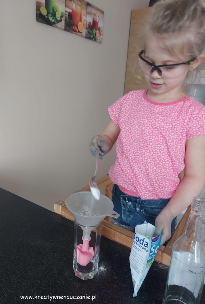- Wsyp sodę do balonu (tym razem lejek znów się przyda – dzięki niemu będzie dużo łatwiej przesypać biały proszek).