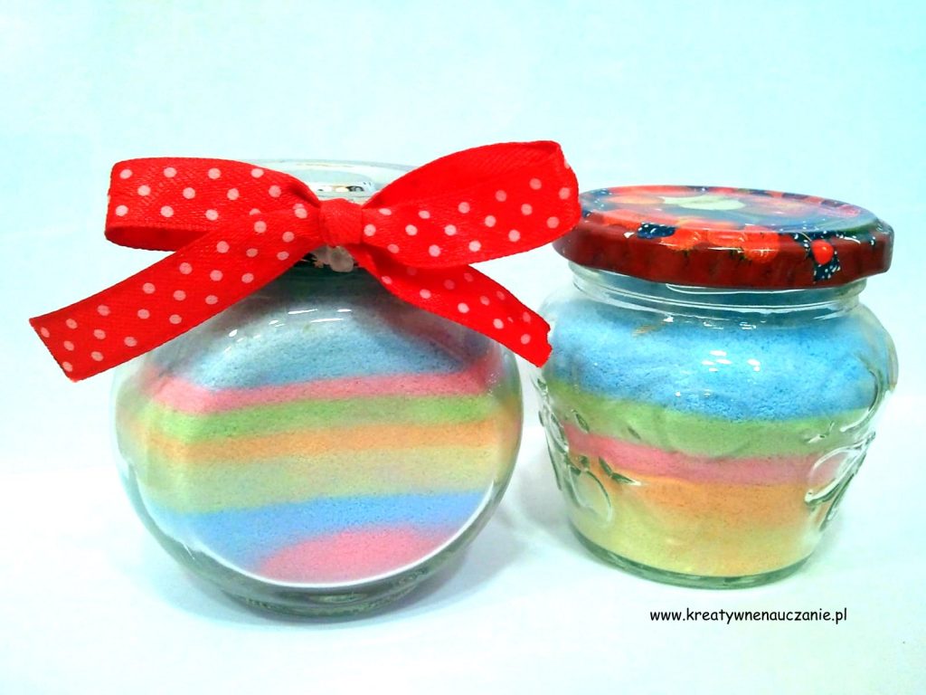 Barwioną sól można wykorzystać też tworząc dekoracyjny słoik, o czym pisałam tutaj: