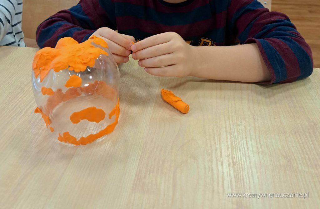 Pierwszoklasiści oklejali butelki plasteliną. Następnie wykałaczkami robili oczy i buzie.