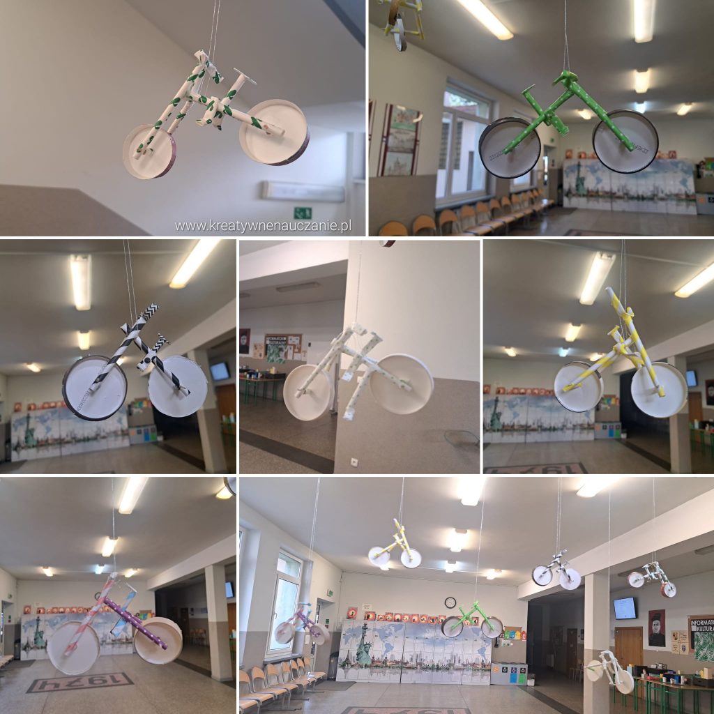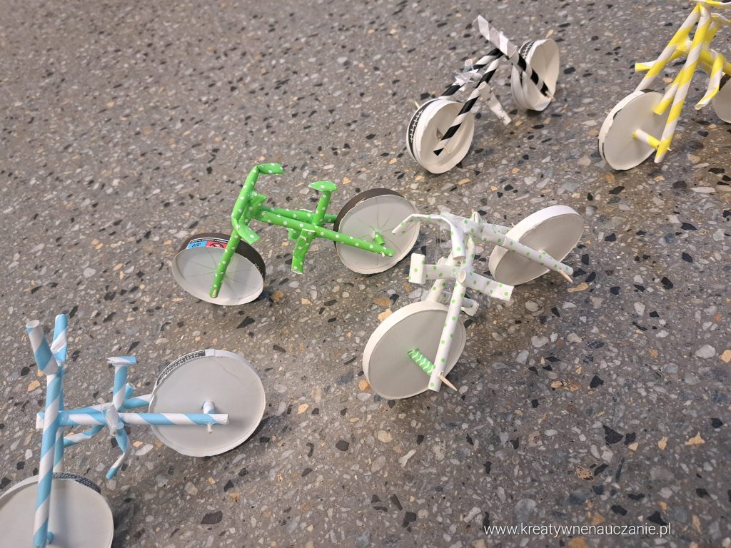 Do wykonania roweru potrzebne były 3 papierowe słomki, 2 papierowe kubeczki i2 wykałaczki. Elementy łączone były klejem na gorąco.