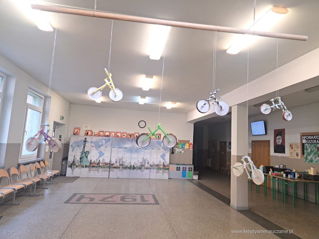 Prace wytwórcze czwartoklasistów podsumowujących temat: „Rowerem w świat”.