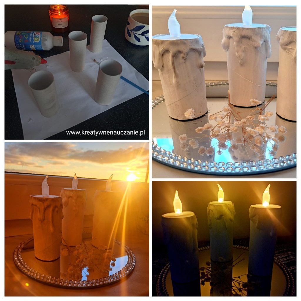 Rolki po papierze toaletowym okleiłam klejem na gorąco, poczekałam do zastygnięcia. Pomalowałam białą farbą plakatową i włożyłam podgrzewacze led.