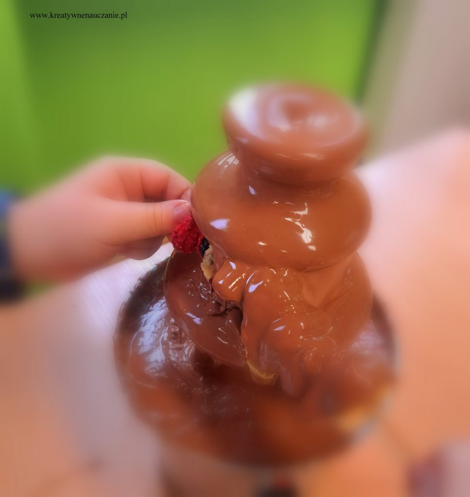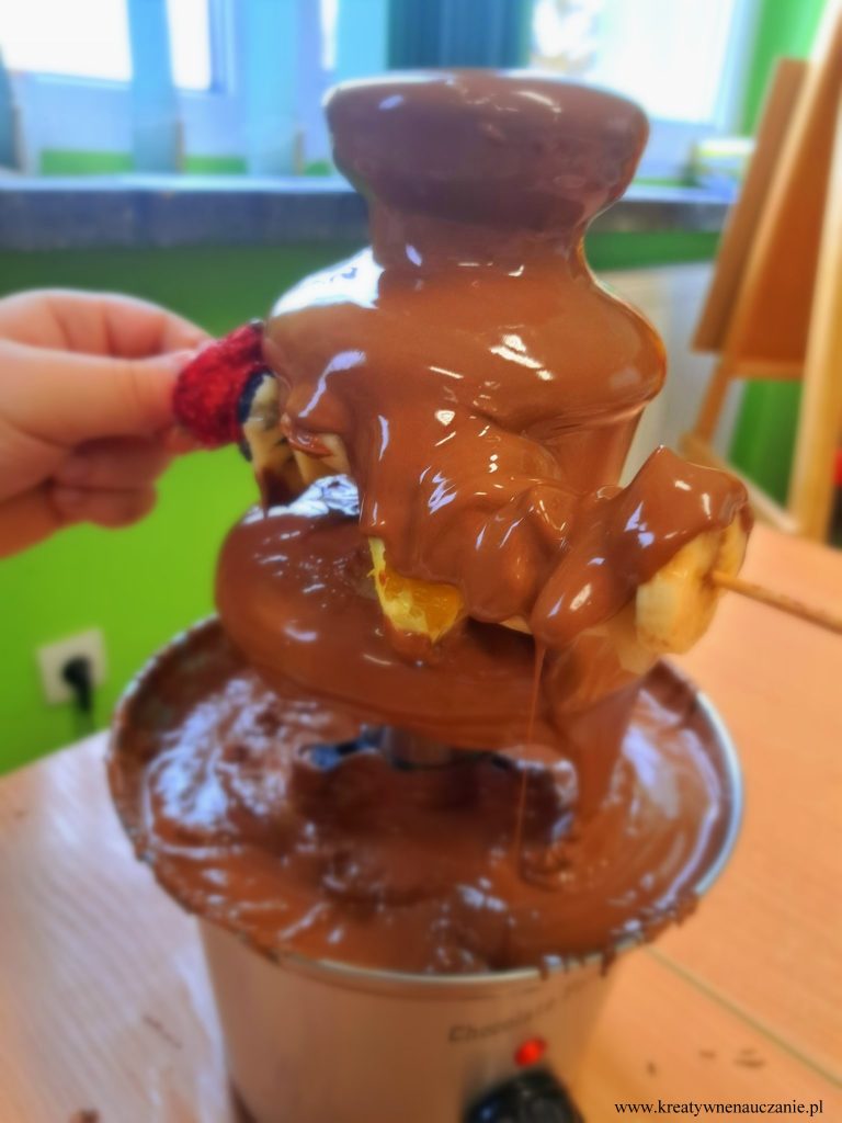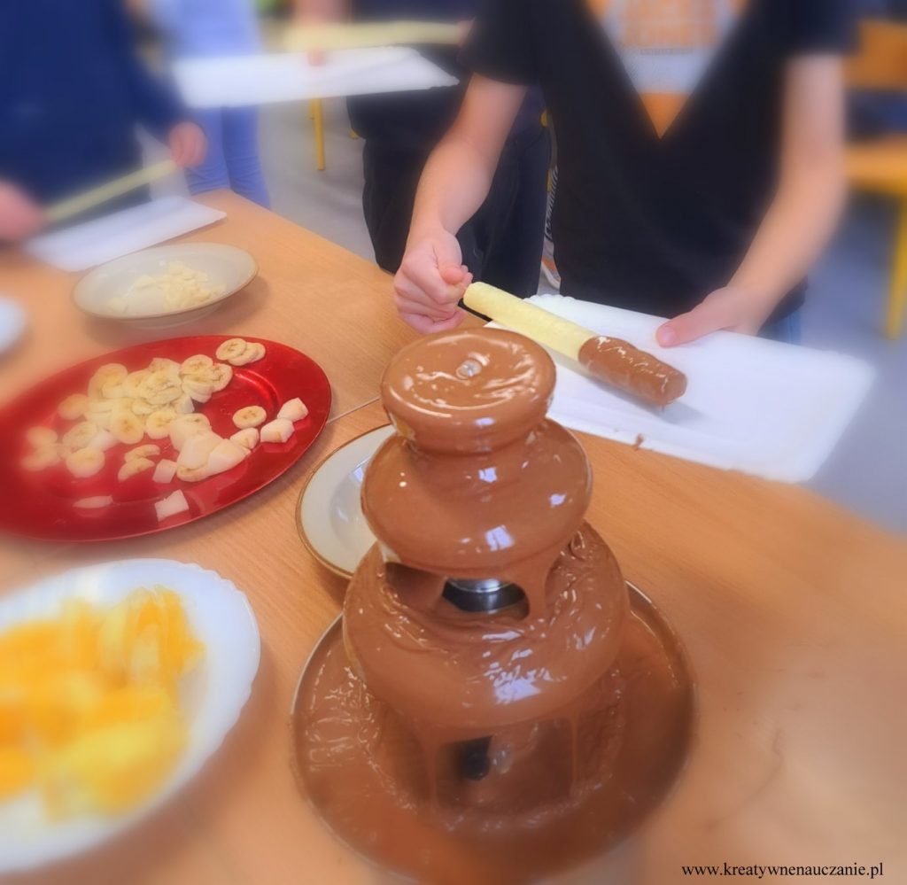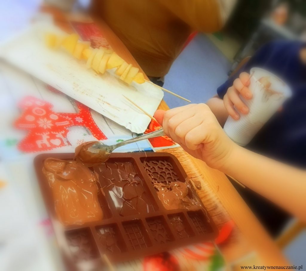 W ubiegłą środę miałam przyjemność poprowadzić warsztaty czekoladowe dla moich pierwszoklasistów. Dzieci dowiedziały się jak powstaje czekolada. Miały możliwość powąchania i spróbowania ziaren kakaowca. Samodzielnie kroili gruszki i jabłka, obierali pomarańcze, z których wykonali koreczki. Degustowali też suszone truskawki i maliny. Komponowali tabliczki czekolady według własnego pomysłu. Na koniec wspólnie tańczyli do piosenki “Czekolada”. Działo się!